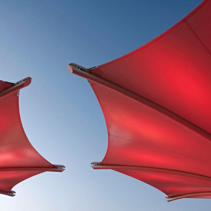 The membrane structure umbrellas, which are made up of 5 well-designed lights, form a unique covered outdoor grandstand ceiling.The 70-meter double-layer movable LED wall brings a vivid and rich visual feast to the audience. The inside of the waterfall curtain wall is well surrounded by 7 outdoor glass windows, which full demonstrating the splendid tradition of the world-famous brand, Volkswagen, and both its technology and its future vision.